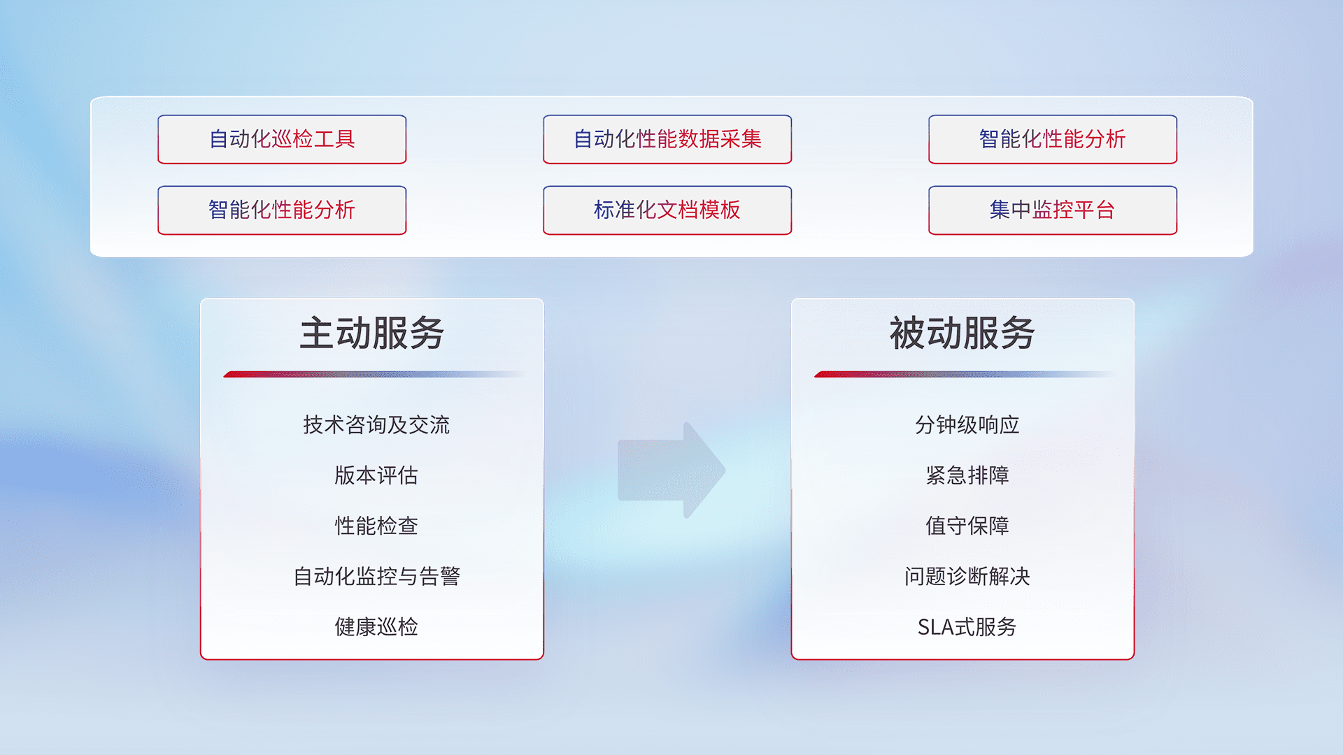 智能化工具和标准化文档,,保障服务质量,,,提供主动服务(包含技术咨询、、、、版本评估、、、、性能检查、、、、自动化监控与告警、、、健康巡检)和被动服务包含(分钟级响应、、紧急排障、、值守保障、、、、问题诊断解决、、、、SLA服务)。。。。