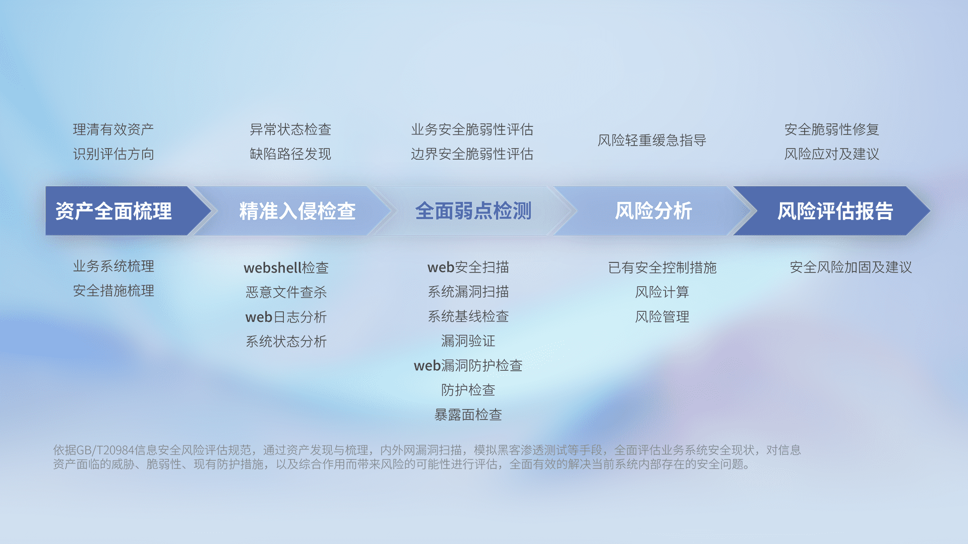 针对客户行业特性,,,以专业的安全服务+多厂商联合解决方案提供专属的一站式安全管理服务,,,帮助客户全面感知网络空间威胁,,,基于识别、、、、检测、、分析、、、防护、、、监测、、、、响应的服务理论模型,,从方案咨询、、集成交付、、评估验证、、、优化加固、、运维运营,,,致力于为客户提供完整的闭环管理式安全服务。。。。以实战经验为客户打造高抵御风险的安全体系,,,,帮助客户发现威胁、、、对抗威胁、、、处置威胁,,,,不断积累安全对抗能力,,持续保障数字化安全。。。