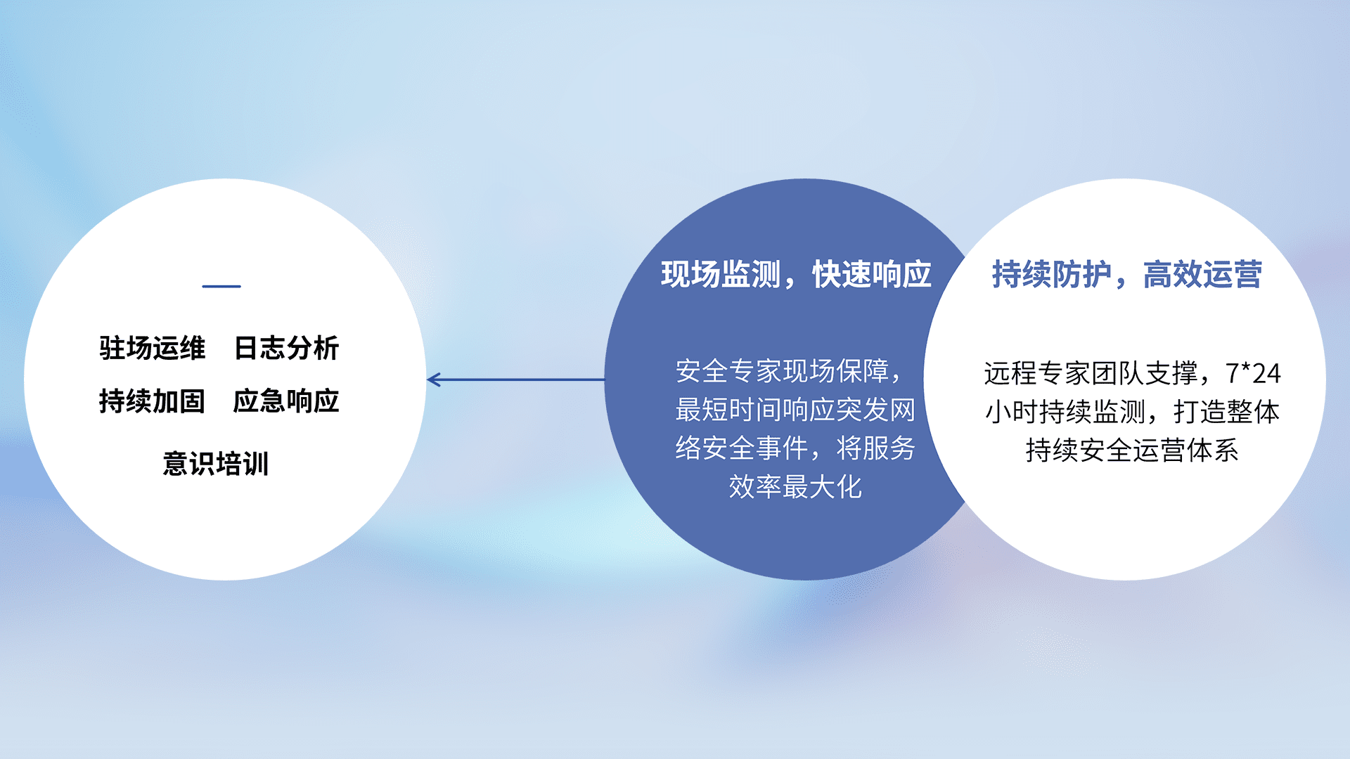 针对客户行业特性,,,,提供专属的一站式安全管理服务,,,,帮助客户全面感知网络空间威胁,,,,通过安全专家的线上、、线下防护支持,,,实现风险闭环,,,,将安全保障常态化,,,,为客户打造常态化安全运维运营服务。。。